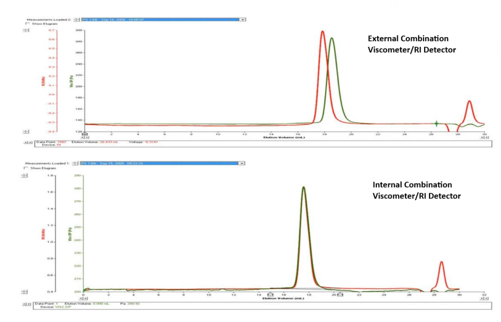 Use of a viscometer within a GPC/SEC System, requires a source of a concentration signal to complete the necessary calculations. The difficulty is that the DRI Detector, which is usually utilized for this task, must deliver a corresponding concentration signal for each point on the viscosity curve. This is possible with two separate instruments, precision of the results, however, will be limited due to the volume difference of the detectors. A combo instruments, where both detectors are integral part of each other, overcomes these limitations and allows a much better determination of the sample under investigation.